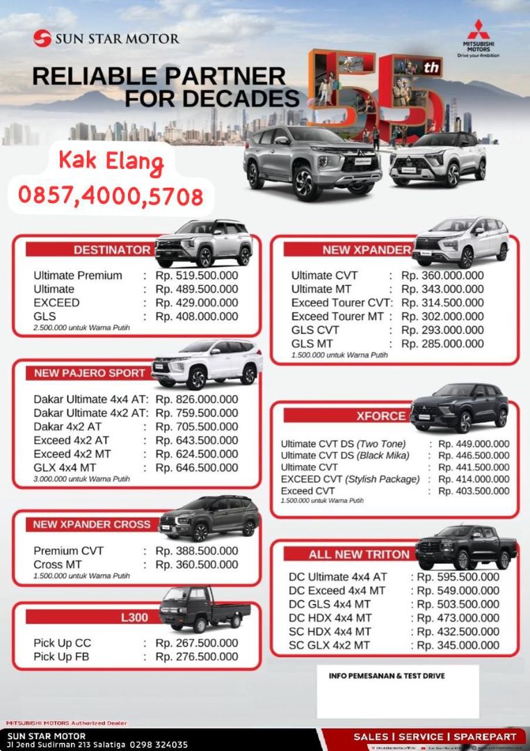 Saya, ingin membantu dan menawarkan harga, diskon, promo, cash dan kredit terbaik. Mitsubishi Salatiga mempunyai Pilihan tipe/varian mobil terlengkap. Asuransi, Tenor, DP murah/Minim dan fleksibel bisa disesuaikan dengan budget Bapak/Ibu.